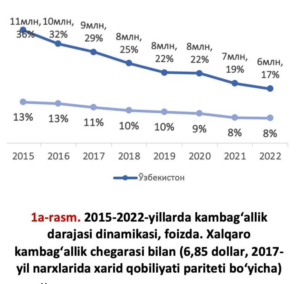 Бунда ўрта даромадли мамлакатларнинг юқори гуруҳига кирувчи давлатлар учун фойдаланиладиган халқаро камбағаллик чегараси бўйича Ўзбекистонда камбағаллик даражаси 2015 йилдаги 35,9 фоиздан 2022 йилда 17,3 фоизгача пасайиб, 5,1 миллион аҳоли камбағаллик ҳолатидан чиқарилди.