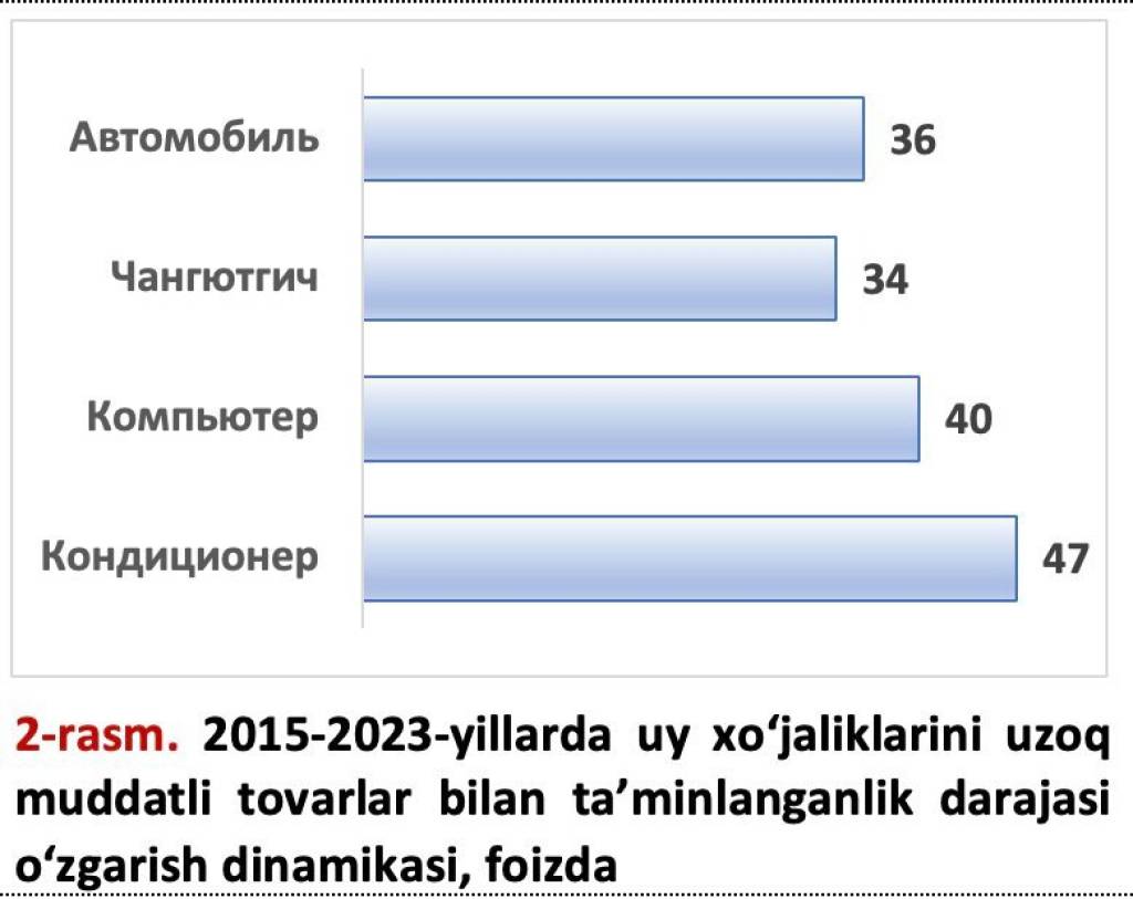 Маълумот ўрнида айтиш жоиз, 1991-2016 йилларда 105 мингта квартирали кўп қаватли уйлар қурилган. 100 та уй хўжалигига тўғри келадиган кондиционерлар сони 2015 йилдаги 32 тадан 2023 йилда 47 тага етган. Бунда ўсиш 47 фоизни ташкил этади. Компьютерлар 47 тадан 66 тага (40%) ва чангютгичлар 53 тадан 71 тага етди (34%).