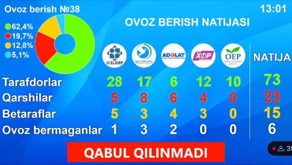 Фикр-мулоҳаза, тортишув ва баҳслардан сўнг қонун лойиҳаси овозга қўйилди ва зарур овозлар сонини тўплай олмагани сабабли рад этилди.