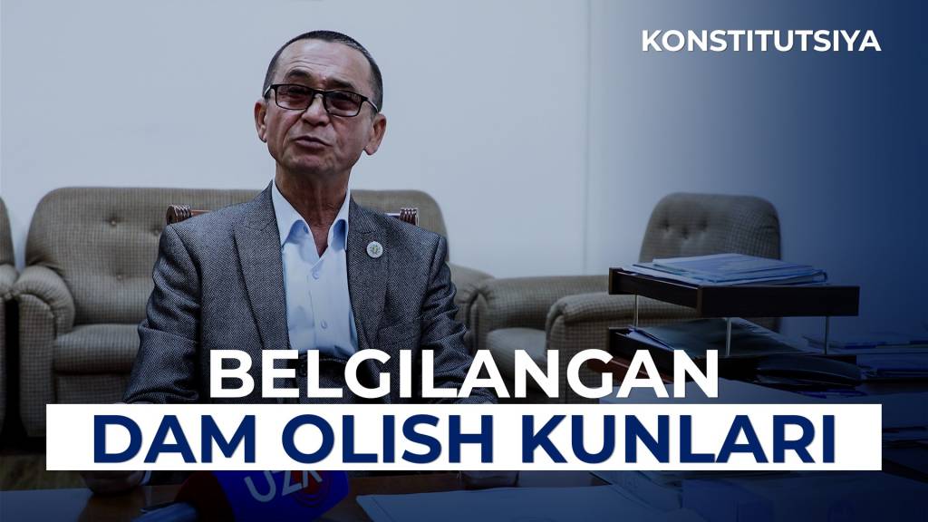 <iframe width="650" height="420" src="https://www.youtube.com/embed/__doekhLwxI" title="Konstitutsiyada belgilangan dam olish kunlari" frameborder="0" allow="accelerometer; autoplay; clipboard-write; encrypted-media; gyroscope; picture-in-picture; web-share" allowfullscreen></iframe>“1 октябрь – Устоз ва мураббийлар куни” сифатида эътироф этилган. Б эса қўшимча дам олиш – ишланмайдиган кунлар сифатида эълон қилинган. Агар ўша кун шанба ёки якшанбага тўғри келадиган бўлса, қўшимча дам олиш куни бўлади, демак реал дам олинган ҳисобланади.