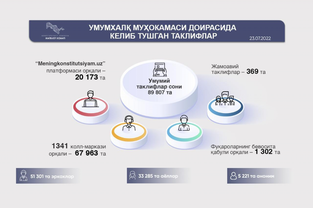 Конституциявий комиссия Матбуот хизматининг маълумотларига кўра, Конституциявий қонуни лойиҳасининг умумхалқ муҳокамаси давомида кенг жамоатчилик томонидан келиб тушган умумий таклифлар сони 23 июль ҳолатига 89 минг 807 тани ташкил этмоқда. Шундан 67 минг 963 таси 1341 қисқа рақами орқали, 20 минг 173 таси “Meningkonstitutsiyam.uz” платформаси орқали, 1 минг 302 таси фуқароларнинг бевосита қабули орқали, 369 таси эса жамоавий тарзда келиб тушган.