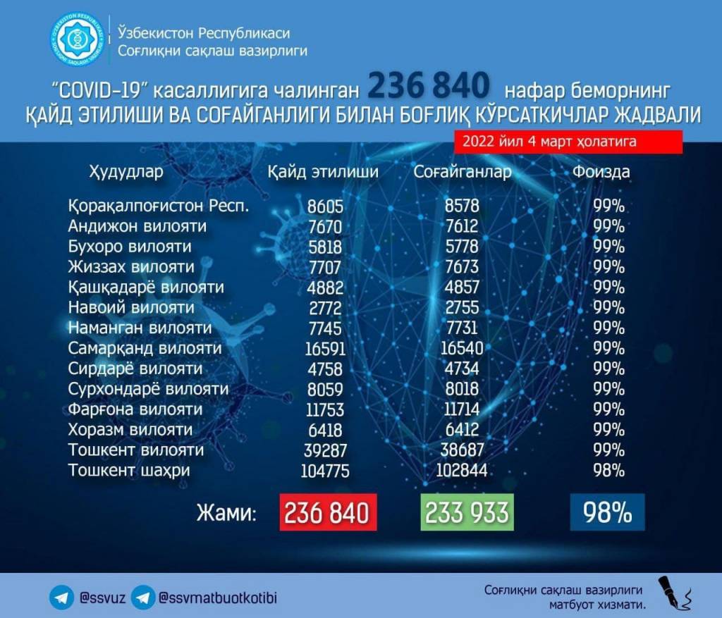 2022 йил 4 март ҳолатига кўра, Ўзбекистонда коронавирус инфекцияси қайд этилганлар сони 236 минг 840 (+69) нафарни ташкил этмоқда.