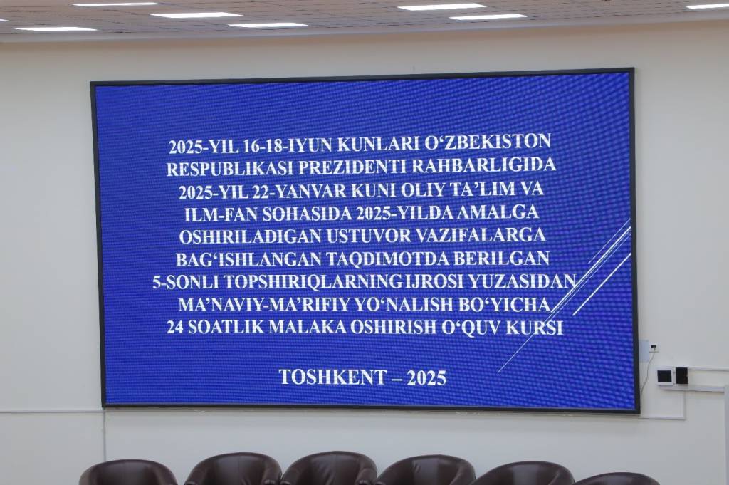 Шу мақсадда, 2025 йил 16 -18 июнь кунлари Ижтимоий-маънавий тадқиқотлар институтининг Малака ошириш бўлими ташаббуси билан Олий таълим, фан ва инновациялар вазирлиги тизимида фаолият юритаётган маънавий-маърифий ишларга масъул ходимлар учун 24 соатлик малака ошириш ўқув курси ташкил этилди.