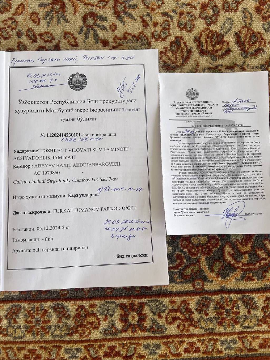 Жиноят ишлари бўйича Ўрта Чирчиқ туман судининг 2025 йилдаги қарорига асосан қарздор Фазлиддин Тиляповдан 174 миллион 790 минг сўм ундирилиб, ижро ҳужжати тамомланган.