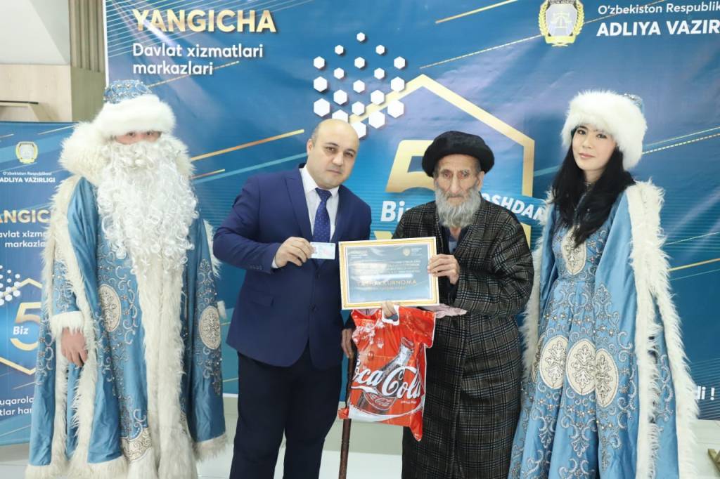 Наманган шаҳрида яшовчи Ҳайбулла Расулов 1932 йилда туғилган. Бундан 90 йил аввалги пайтдаги хатолик сабаб кекса нуронийнинг фуқаролик паспортида туғилган ой ва куни нотўғри ёзилган. Отахоннинг қилган мурожаати шаҳар давлат хизматлари маркази томонидан ижобий ҳал этилиб, фуқароликни расмийлаштирувчи “ID” карта ҳамда хорижга чиқиш биометрик паспорти берилди. Қолаверса, табаррук бобо бошқарма томонидан хизматдан фойдаланган “Энг кекса мижоз” сифатида эътироф қилиниб, эсдалик совғалари билан тақдирланди.