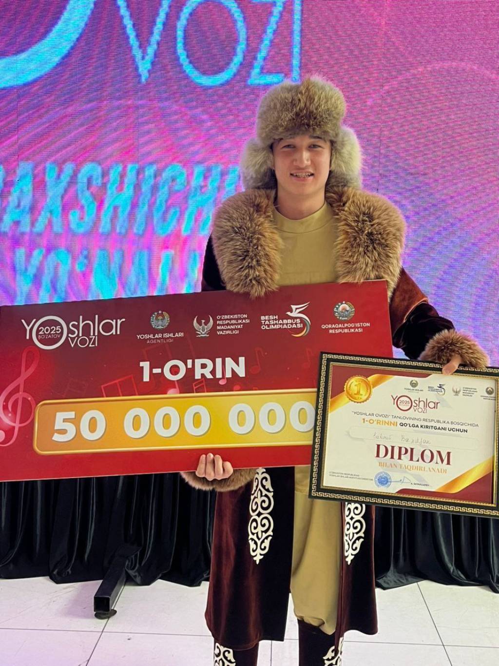 “Ёшлар овози” кўрик-танловининг Республика босқичида бахшилик йўналиши бўйича 16–20 ёш тоифаси орасида Навоий вилояти, Зарафшон шаҳридаги 4-умумий ўрта таълим мактаби 9-синф ўқувчиси Бақитжан Сабиров ва “Аманат” этно-ансамбли биринчи ўринни эгаллади.