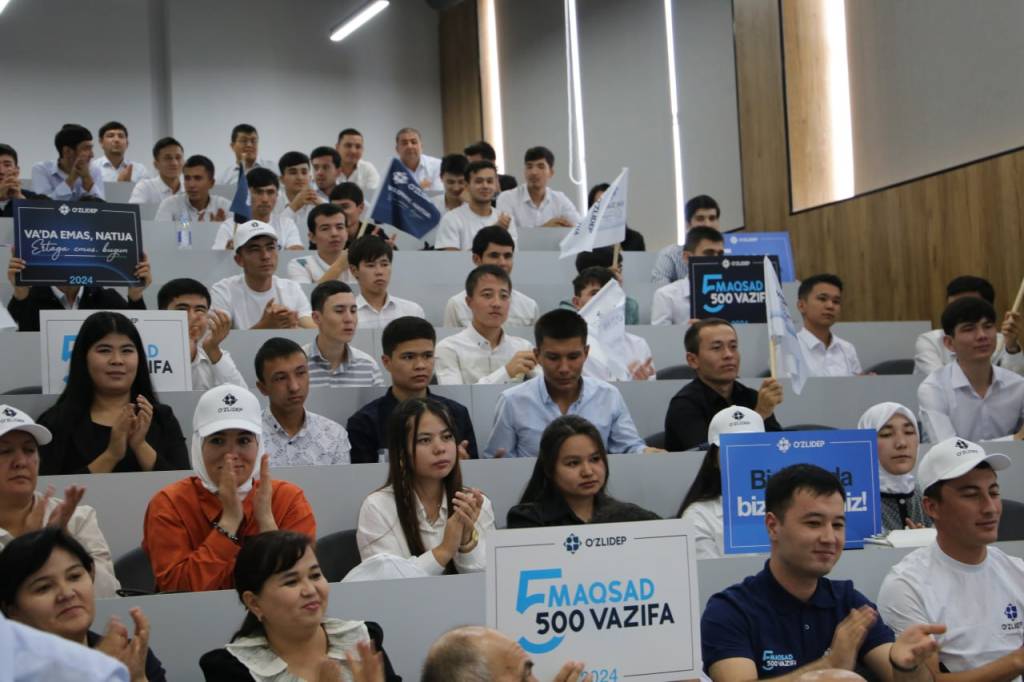 “Ваъда эмас, натижа. Эртага эмас, бугун” шиори остида ташкил этилган тадбирда дастлаб олийгоҳ ҳовлисида ўрнатилган партия чодири атрофида хайрихоҳ бўлган талаба-ёшлар билан учрашган партия етакчиси Актам Ҳайитов эл-юрт тақдирига бефарқ бўлмасдан, ўзининг мустаҳкам сиёсий позицияси ва шижоати билан мамлакат ижтимоий-сиёсий ҳаётида иштирок этаётганликлари учун миннатдорчилик билдирди. Ўз навбатида партия ҳам ўзининг келгуси беш йилликдаги фаолияти мазмунини белгилаб берган муҳим ҳужжатида уларга катта эътибор қаратилгани таъкидланди.