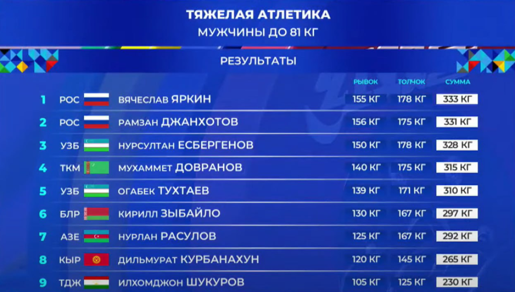 Кеча ҳам ушбу ёқимли анъана бузилмади. 81 кг вазн тофиасида қайд этилган спортчимиз Нурсултон Есбергенов медаллар учун муросасиз кураш олиб борган 9 нафар атлет орасида муносиб натижа кўрсатди. Даст кўтаришда 150, силтаб кўтаришда 178 кг оғирликдаги штангани ўзига бўйсиндирган вакилимиз россиялик икки кучли рақибидан кейин 3-ўринни эгаллади. Иккикурашда шоҳсупага кўтарилган уч спортчи – Вячеслав Яркин 333, Рамзан Жанхотов 331, Нурсултон Есбергенов 328 кг натижа кўрсатгани ғолиблик учун кураш нақадар кескин давом этганидан далолат.