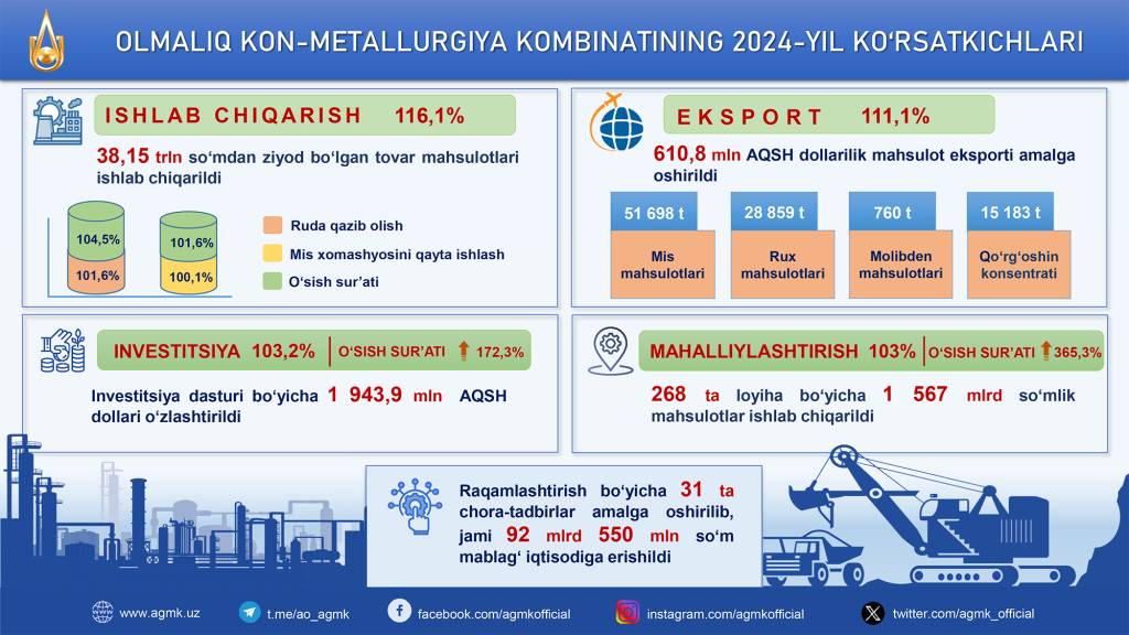 Олмалиқ кон-металлургия комбинати 2024 йилда бизнес режада белгиланган барча ишлаб чиқариш кўрсаткичларини бажарди. Хусусан, 38,1 триллион сўмлик товар маҳсулотлари ишлаб чиқарилиб, режа 116,1 фоизга бажарилган. Шунингдек, 7,5 миллиард сўмлик халқ истеъмоли моллари тайёрланган.