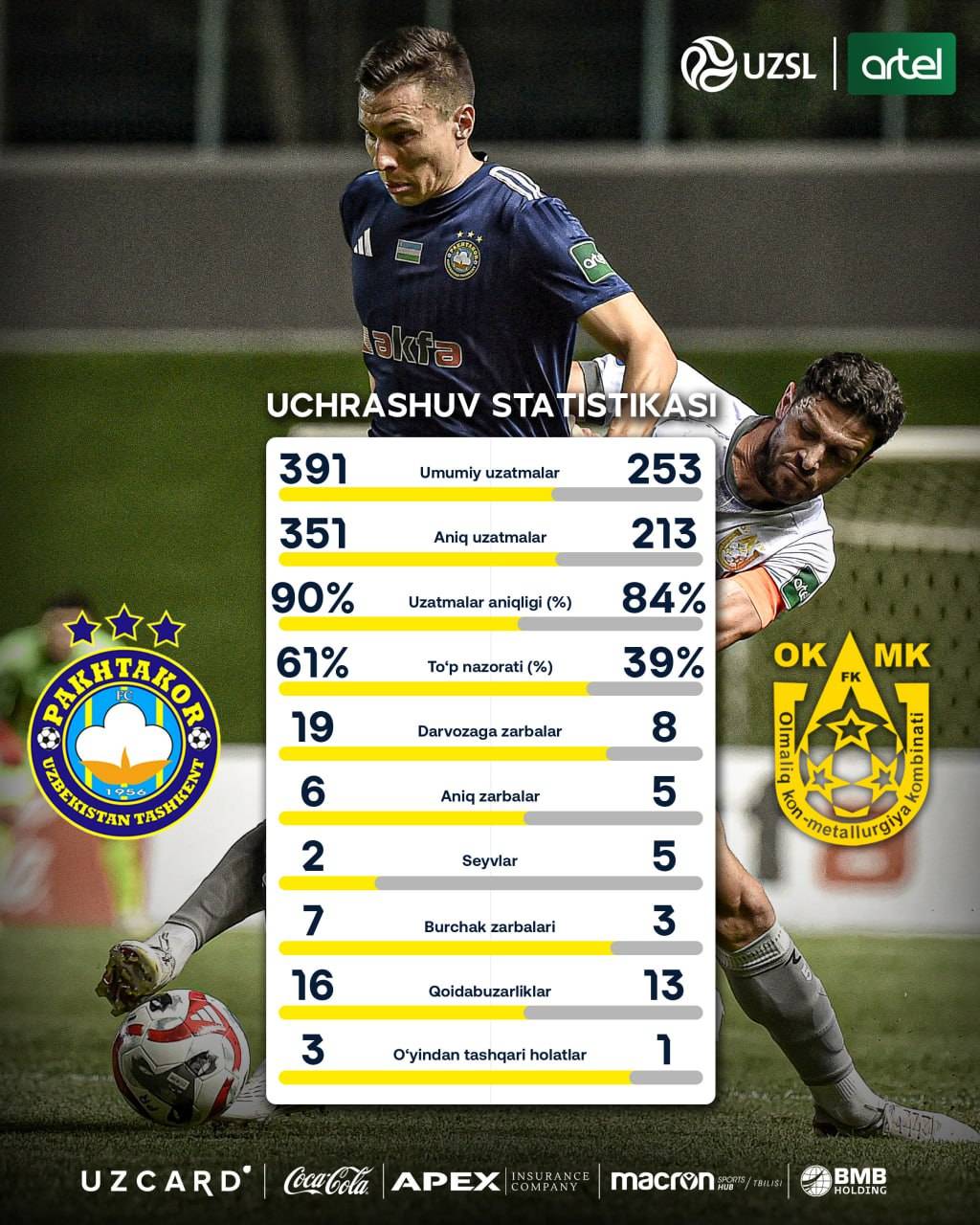 “Жар” стадионида ўтган ушбу ўйинда ОКМК 2:1 ҳисобида ғалаба қозонди. Мазкур жамоага муҳим ғалабани тақдим этган голларга Рубен Санчес муаллифлик қилган бўлса, “Пахтакор” клубининг ягона голи 47-дақиқада Игор Сергеев томонидан киритилди. Шу тариқа, ОКМК очколарини 33 тага етказиб олди, “Пахтакор” эса 29 очко билан қолди.