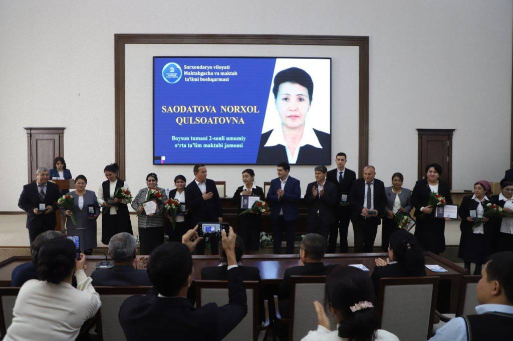 Вилоятда таълим-тарбия сифати ва самарадорлигини оширишга муносиб ҳисса қўшган бир гуруҳ фидойи педагоглар "Халқ таълими аълочиси, "Халқ таълими фидойиси", "Таълим ҳомийси" кўкрак нишонлари билан тақдирланди. Шунингдек, Мактабгача ва мактаб таълими вазирининг фахрий ёрлиқлари, Ангор туманидаги 1- ва Бойсун туманидаги 2-умумтаълим мактаблари жамоасига вазир ташаккурномаси топширилди.