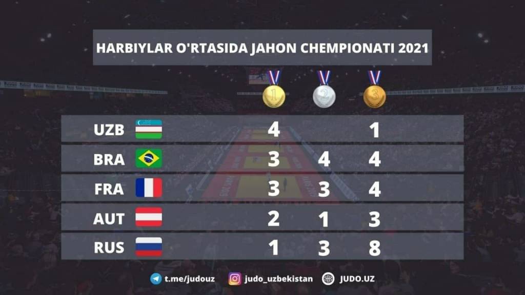 Дзюдо бўйича Ўзбекистон терма жамоаси Франция пойтахти Париж шаҳрида давом этаётган ҳарбийлар ўртасидаги жаҳон чемпионатида муваффақиятли иштирок этмоқда.