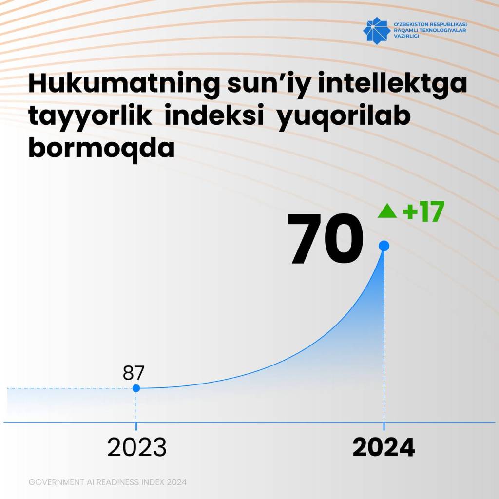 “Oxford Insights” ташкилоти эълон қилган “Ҳукуматнинг сунъий интеллектга тайёрлик индекси” рейтингида Ўзбекистон 53,45 балл билан 70-ўринни эгаллаб, 17 поғонага кўтарилди. Марказий Осиё давлатлари орасида эса 1-ўринни қўлга киритди.
