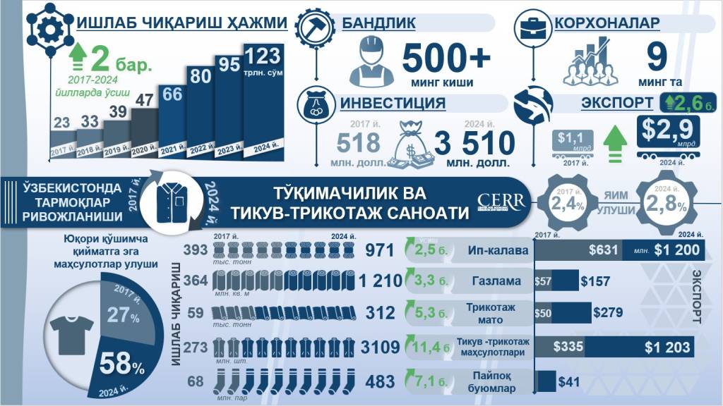 2017-2024 йиллар мобайнида тармоқда тайёр маҳсулот улуши сезиларли даражада ошди – “Ўзтекстилсаноат” ассоциацияси маълумотларига кўра, 2017 йилдаги 27 фоиздан 2024 йилда 58 фоизга етди. Шу билан бирга, тайёр тикув-трикотаж маҳсулотлари ишлаб чиқаришида катта ўсиш кузатилди – 8 йилда 11,4 баробар. Ўтган йил якунига кўра бундай маҳсулот ишлаб чиқариш ҳажми 3,1 млрд. донадан ошди.