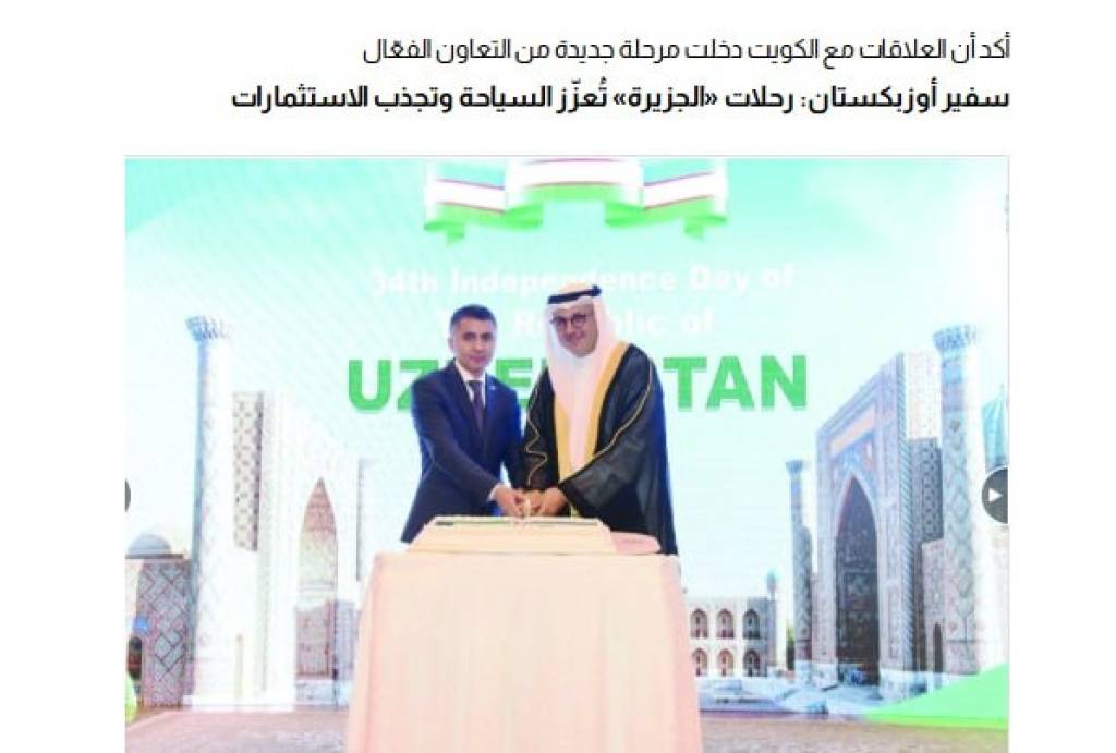 Кувайтнинг “Al-raimedia” нашрида Ўзбекистон элчихонаси томонидан мустақиллигимизнинг 34 йиллиги ушбу араб давлатида ҳам кенг нишонлангани ёритилди. Элчи Аюб Юнусов мамлакатларимиз томонидан олиб борилаётган оқилона ташқи сиёсат умумий тараққиёт ва халқаро ҳамкорликни юксалтиришга хизмат қилаётганини таъкидлади.