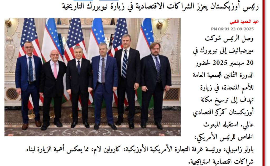 Иордания Ҳошимийлар Қироллигининг “Ammonnews” нашрида Ўзбекистон Республикаси Президенти Шавкат Мирзиёев Нью-Йорк шаҳрига ташрифи ишбилармонлик дастури доирасида Америка етакчи компаниялари, инвестиция жамғармалари ва молиявий институтлари раҳбарлари билан учрашиб, давра суҳбати ўтказганини ёритди.