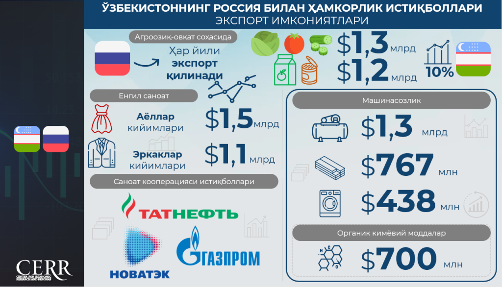 Иқтисодий тадқиқотлар ва ислоҳотлар маркази томонидан тақдим этилган шарҳда Ўзбекистон ва Россия ўртасидаги савдо-иқтисодий ҳамкорлик ҳамда инвестициявий алоқалар динамикаси, шунингдек, кооперацияни янада чуқурлаштириш учун истиқболли йўналишлар акс эттирилган.