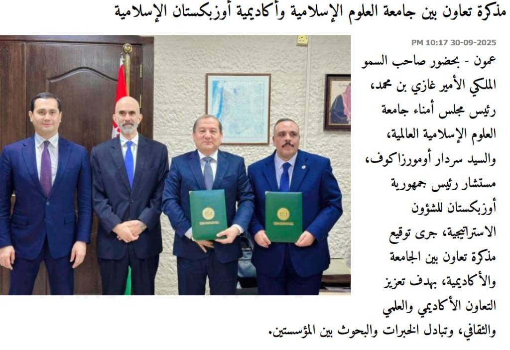 Ташриф доирасида Ўзбекистон халқаро исломшунослик академияси ва Иордания халқаро ислом илмлари университети (ректори Жаъфар Маҳмуд Ал-Фанацо) ўртасида Ҳамкорлик меморандуми имзоланди. Мазкур университет нафақат Иордания, балки минтақанинг исломшунослик соҳаси бўйича энг нуфузли таълим даргоҳларидан бири ҳисобланади.