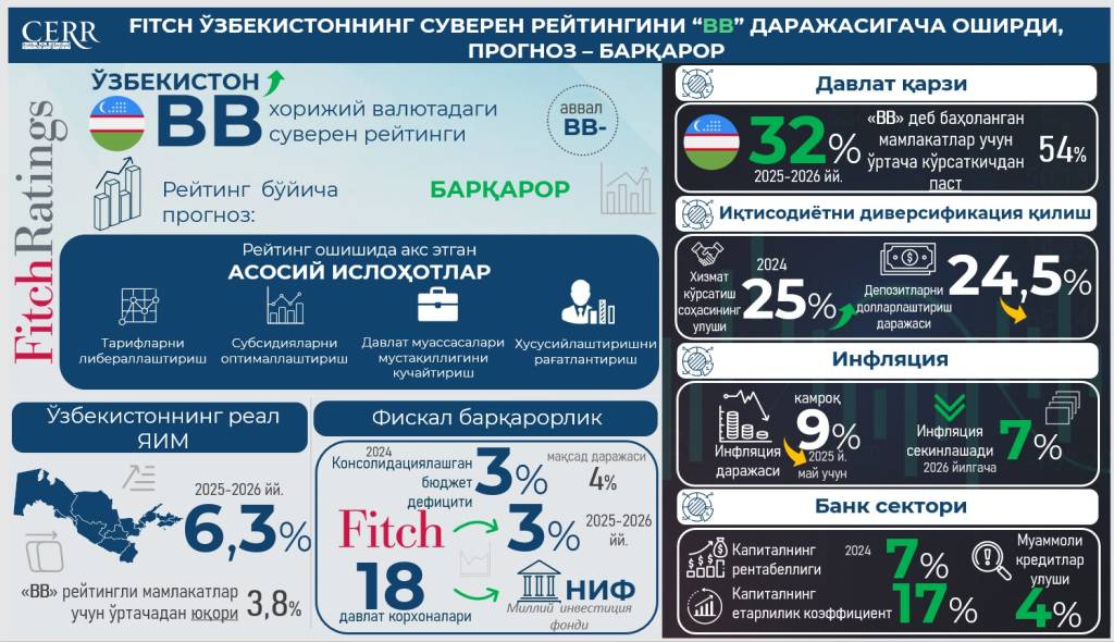Fitch Ratings халқаро рейтинг агентлиги Ўзбекистон Республикасининг хорижий валютадаги узоқ муддатли дефолт рейтингини (IDR) “BB-” дан бир поғона юқорига “BB” даражасига кўтарди. Рейтинг прогнози “Барқарор” деб белгиланди.
