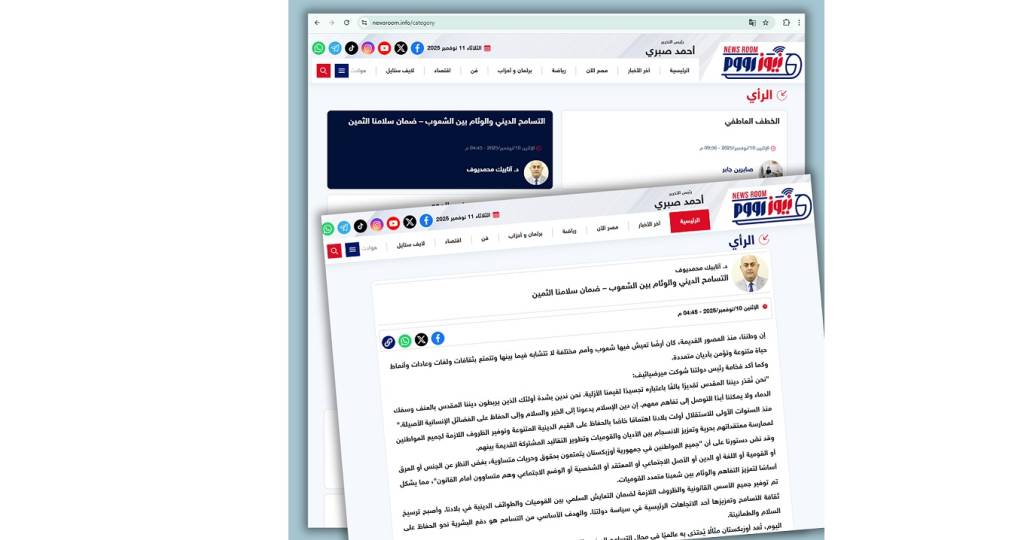 Жорий йилнинг 10 ноябрь куни Миср Араб Республикасининг newsroom.info интернет нашрида Имом Бухорий халқаро илмий-тадқиқот маркази катта илмий ходими Отабек Муҳаммадиевнинг “Диний бағрикенглик ва миллатлараро тотувлик – бебаҳо тинчлигимиз гарови” сарлавҳали мақоласи эълон қилинди.