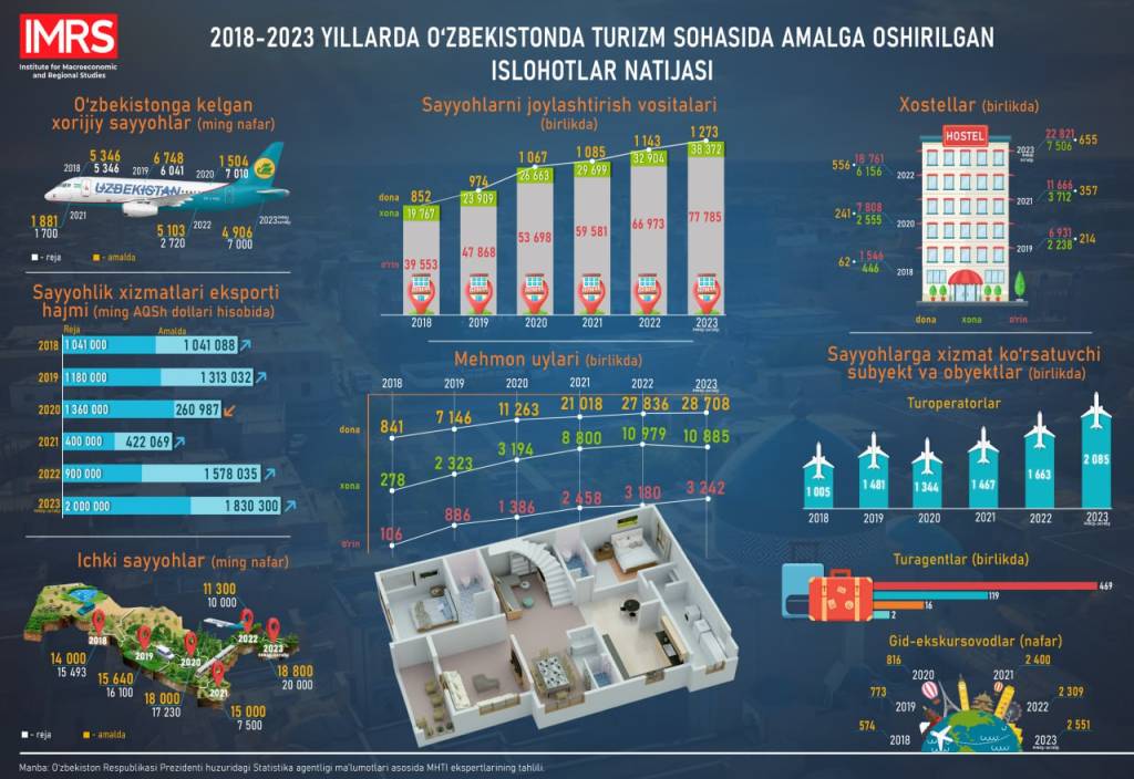 Макроиқтисодий ва ҳудудий тадқиқотлар институти мутахассислари таҳлилига кўра, 2023 йилнинг январь-октябрь ойларида Ўзбекистонга келган хорижлик сайёҳлар сони 4,9 миллион нафарга етган. Охирги уч йилда туристлар оқими қарийб 3 баробар кўпайган. 2021 йилда эса хорижлик сайёҳлар сони 1,8 миллион нафарни ташкил қилган эди.