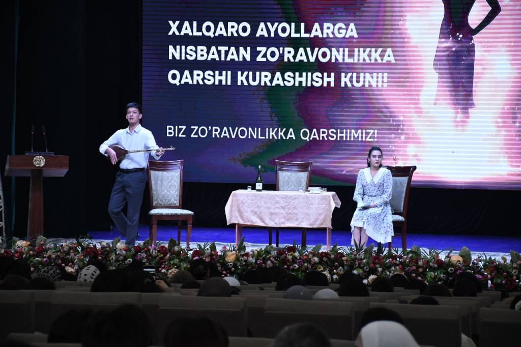Тадбирда зўравонликка қарши саҳна кўринишлари, бадиий чиқишлар намойиш этилди.