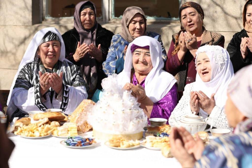Майдоннинг бир томонида кайвони онахонлар учун тўкин дастурхон ёзилди. Улар катта дошқозонда баҳорий таом сумалак ва палов тайёрлашди.