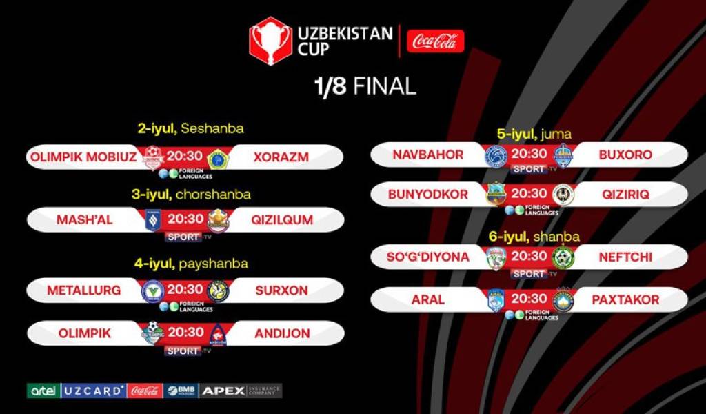 Бугун Ўзбекистон кубогининг нимчорак финалидан ўрин олган яна иккита учрашув бўлиб ўтади. Жумладан, Тошкентда «Олимпик» ва «Андижон» ўзаро баҳс олиб борса, Олмалиқда «Металлург» «Сурхон»ни синовдан ўтказади.