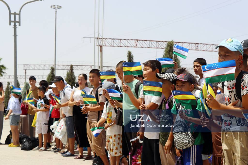 Қорақалпоғистон Республикаси Тахиатош туманидан келган 7–14 ёшдаги 101 нафар ўғил-қиз Термиз темир йўл вокзалида тантанали кутиб олинди.