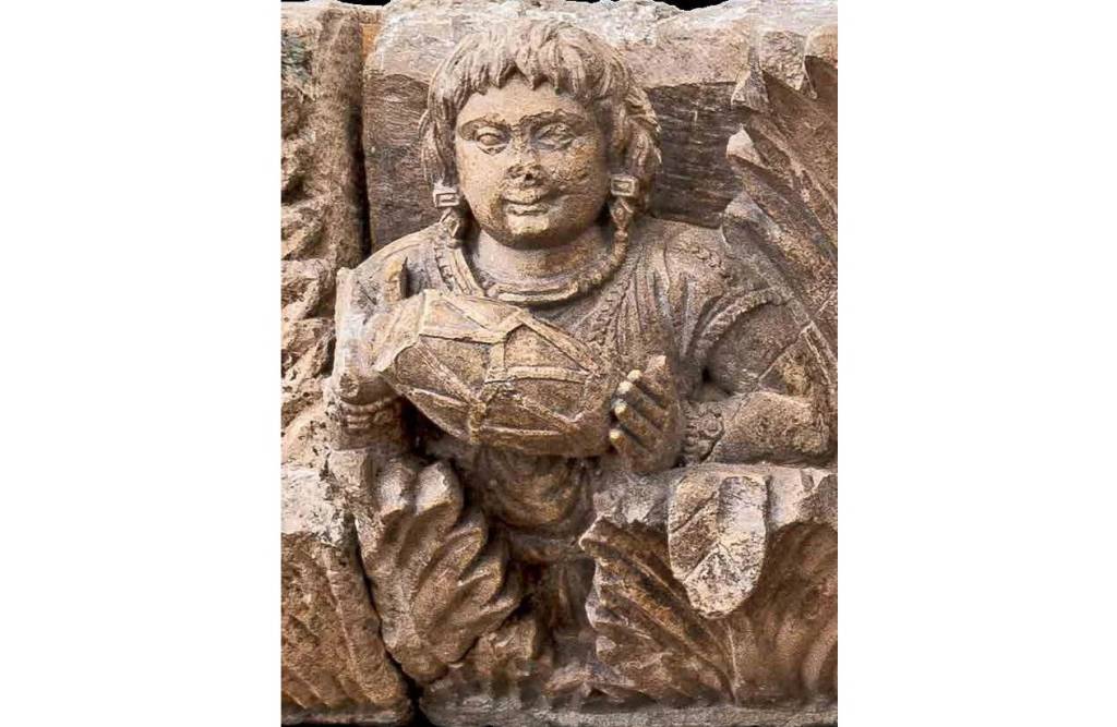 Учинчи ҳайкалда арфа чалаётган созанда тасвирланган бўлиб, унинг юзи тўғрилигига қараб, бош кийимидан бой-бадавлат экани ойдинлашади. Бош кийимида ромб шаклидаги тешикча бор. Пешонасида занжирчага боғланган юракча шаклидаги тақинчоқ, қулоғида узунчоқ томчисимон сирға кўзга ташланади. Ўнг қўлида енгли пластинкали ва тошлар билан бошқариладиган билагузук, чап қўлида тўғри тўртбурчак тошлар билан безалган билагузук. Бўйнида катта шода мунчоқ ва икки қатор тошли маржон, ўртасида медальон кўринишидаги безак акс эттирилган. Елкасига енгил мато ёки шарф кийимда, чап қўли билан вертикал ҳолатда чолғу асбобини ушлаб, ўнг қўли билан чилторнинг торларини чертмоқда (горелиефда 9 та тор кўринади).