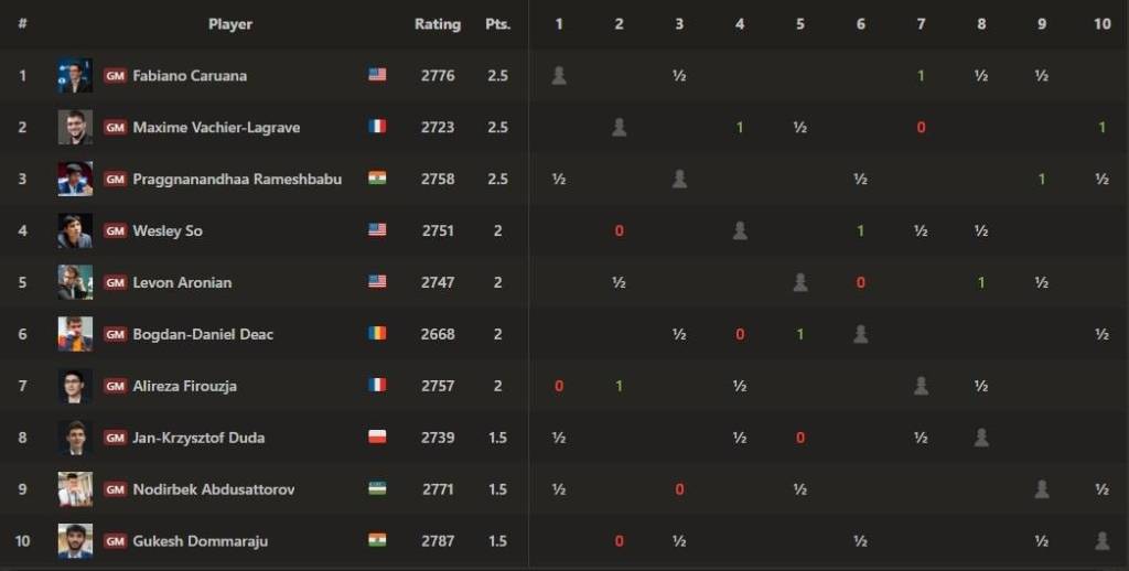 5-тур олдидан турнир жадвалига назар ташлайдиган бўлсак, Фабиано Каруана 2,5 очко билан қўшимча кўрсаткичлар асосида етакчилик қилмоқда. Нодирбек Абдусатторов эса 1,5 очко билан 9-ўринда бормоқда.