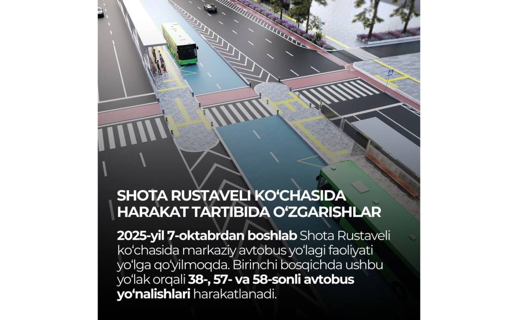Маълумотга кўра, 2025 йил 7 октябрдан бошлаб Шота Руставели кўчасида марказий автобус йўлаги (BRT йўлаги) фаолияти йўлга қўйилмоқда. Лойиҳанинг биринчи босқичида 37-, 57- ва 58-сонли автобуслар айнан йўлнинг ўрта қисмида жойлашган махсус ажратилган йўлак орқали ҳаракатланади.