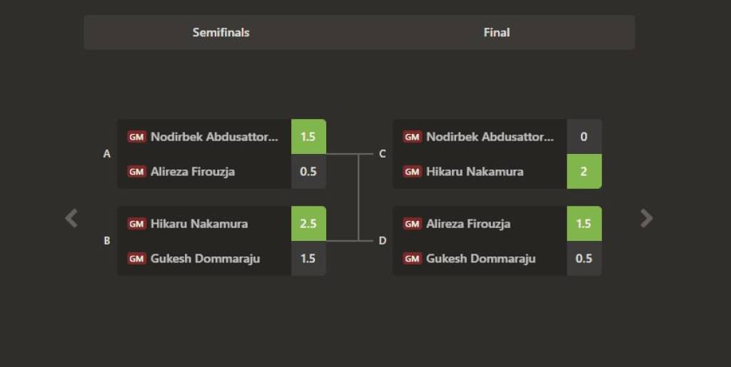 5-ўрин учун Нодирбек Абдусатторов ва америкалик Ҳикару Накамура ўртасидаги курашда океан орти вакилининг қўли баланд келди ва 50 минг АҚШ доллари соҳиби бўлди. Ҳамюртимиз Абдусатторов ўз навбатида 40 минг АҚШ доллари соҳибига айланди.
