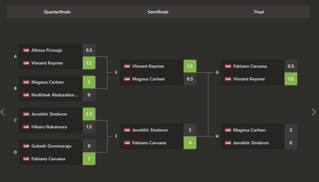 Мусобақа финалида германиялик Винсент Кеймер ва америкалик Фабиано Каруана учрашувида немис шахматчисига омад кулиб боқди ва “Freestyle Chess Grand Slam-2025”нинг бош соврини бўлган 200 минг АҚШ долларини қўлга киритди. 2-ўриндан жой олган Каруанага 140 минг АҚШ доллари насиб этди. Шу ўринда айтиш лозим, “Freestyle Chess Grand Slam-2025” турнири жорий йилдан ўтказилиши йўлга қўйилди. Унинг биринчи мусобақаси Германияда муваффақиятли ташкил этилди. Турнирнинг кейинги босқичлари жорий йилнинг 8–15 апрель кунлари Франция пойтахти Парижда, 17–24 июлда АҚШнинг Нью-Йорк шаҳрида, 17–24 сентябрда Ҳиндистоннинг Деҳли шаҳрида ва 5–12 декабрь кунлари Жанубий Африка Республикасининг Кейптаун шаҳрида бўлиб ўтади.