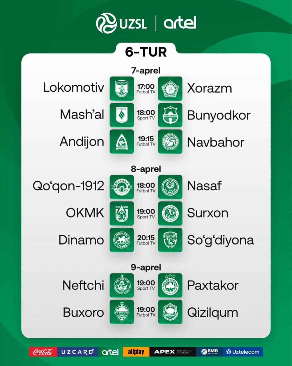 Маълумот учун, Суперлиганинг 6-турида 8 апрель куни “Қўқон-1912” ўз майдонида “Насаф”ни синовдан ўтказса, ОКМК — “Сурхон” ҳамда “Динамо” — “Сўғдиёна” жамоалари ўзаро куч синашади.