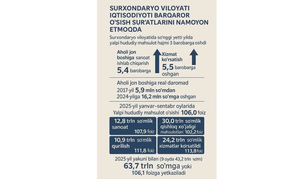 Бир пайтлар аграр воҳа ҳисобланган жанубий вилоятда бугунги кунда замонавий саноат, қурилиш ва хизмат кўрсатиш соҳалари жадал ривожланмоқда. Маҳалла ва қишлоқлар қиёфаси тубдан ўзгариб, аҳоли турмуш даражаси тобора юксалмоқда. Бу эса ҳудудда иқтисодиётни диверсификация қилиш, ишлаб чиқариш ва хизмат кўрсатиш йўналишларида яратилаётган қулай шароитлар, инвестиция муҳитининг яхшиланиши ҳамда тадбиркорликни қўллаб-қувватлашга қаратилган эътиборнинг амалий самарасидир.