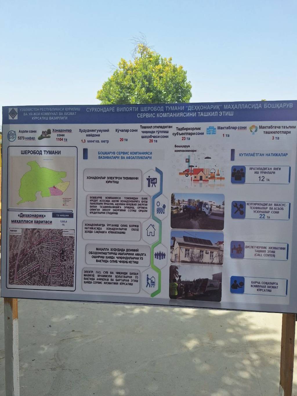 Вилоятда сервис компаниялари ишини йўлга қўйишда қурилиш ва уй-жой коммунал хўжалиги бошқармаси тажрибасидан фойдаланилди. Айрим маҳаллалар етарли иш тажрибасига эга мавжуд бошқарув сервис компанияларига қўшиб берилди. Масалан, Шеробод туманидаги Дехқонариқ маҳалласида “Шеробод обод кўркам ҳаёт” масъулияти чекланган жамияти ташкил этилиб, хизмат кўрсатиши учун маҳалладаги бўш турган бино ажратилди. Беш ишчи ходим ишга қабул қилинди. Ўн хил турдаги асбоб-ускуна ва жиҳоз билан таъминланди.