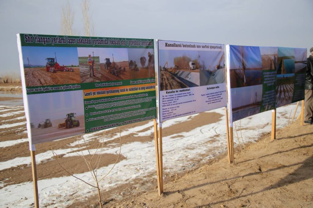 2025 йил учун белгиланган сув сарфини камайтириш мақсадида сув тежовчи технологиялардан фойдаланиш учун томчилатиб суғориш учун 500 гектар, ёмғирлатиб суғориш учун 150 гектар, дискрет орқали суғориш учун 60 гектар, эгилувчан қувур 800 ва эгатга плёнка тўшаб 180 гектар ҳамда лазерлик текислаш 1600 гектар, умумий 3 минг 290 гектар манзилли дастур қилиб олинди.