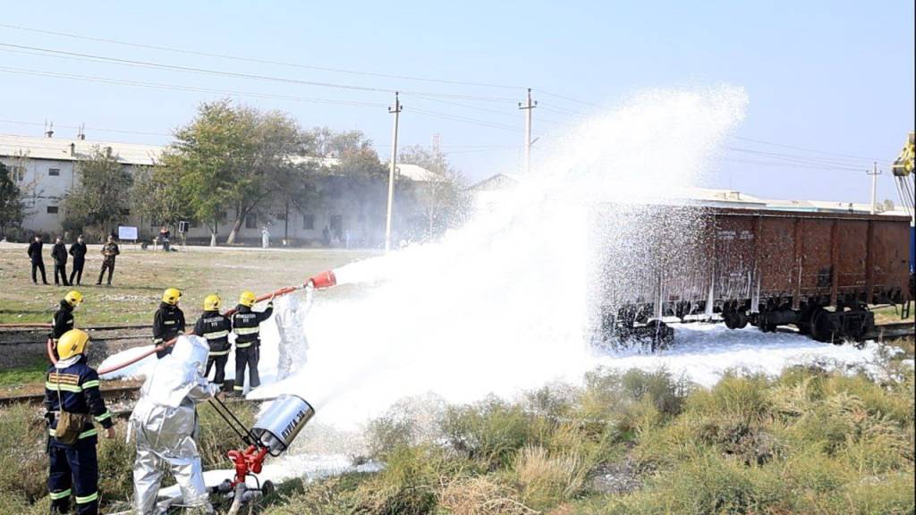 Шундан сўнг, ёқилғи ташиш вагони ва алангаланувчи маҳсулотлар ортилган юк вагонида содир бўлган ёнғинни бартараф этиш, жабрланганларга биринчи тиббий ёрдам кўрсатиш борасида тактик ўқув машқи ўтказилиб, фуқаро муҳофазаси тузилмаларининг ҳамкорликдаги ҳаракатлари амалда кўриб чиқилди.