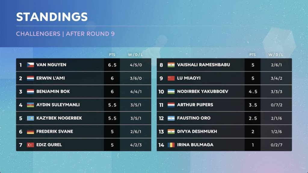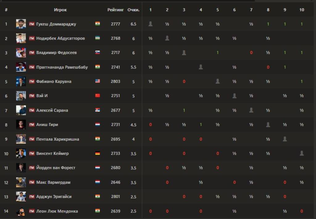 Айнан ушбу натижалардан кейин Доммаражу Гукеш 6,5 очко билан якка пешқадамга айланиб олди. 6 очкога эга Нодирбек Абдусатторов ва Владимир Федосеев 2- ва 3-ўринни банд этиб турибди. Кейинги поғонани банд этган Праггнанандха ҳисобида 5,5 очко мавжуд.