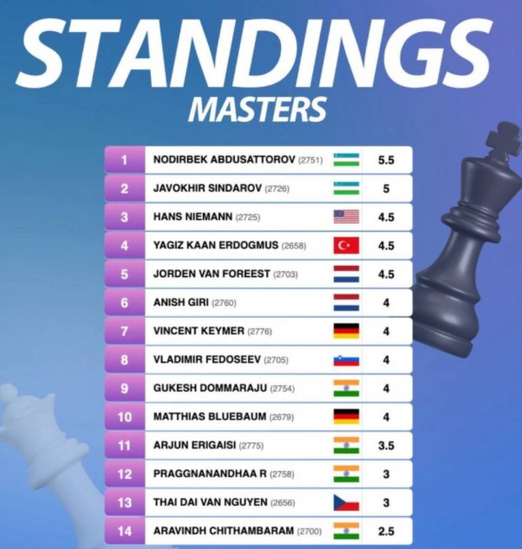 Турнирнинг энг кучли 14 нафар иштирокчиси жам бўлган "Мастерс" гуруҳида етакчилик қилаётган Нодирбек Абдусатторов ва Жавоҳир Синдоровнинг тўқнашуви нафақат мамлакатимиз, балки дунё шахмат ишқибозлари эътиборини ўзига қаратиши билан аҳамиятли ҳисобланади.