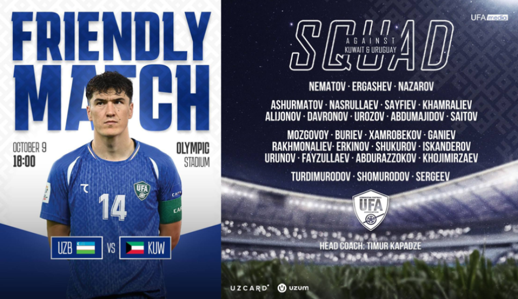 Ўзбекистон миллий терма жамоаси 9 октябрь куни Тошкентда Кувайт ҳамда 13 октябрь куни Малайзияда Уругвай терма жамоасига қарши майдонга тушади.