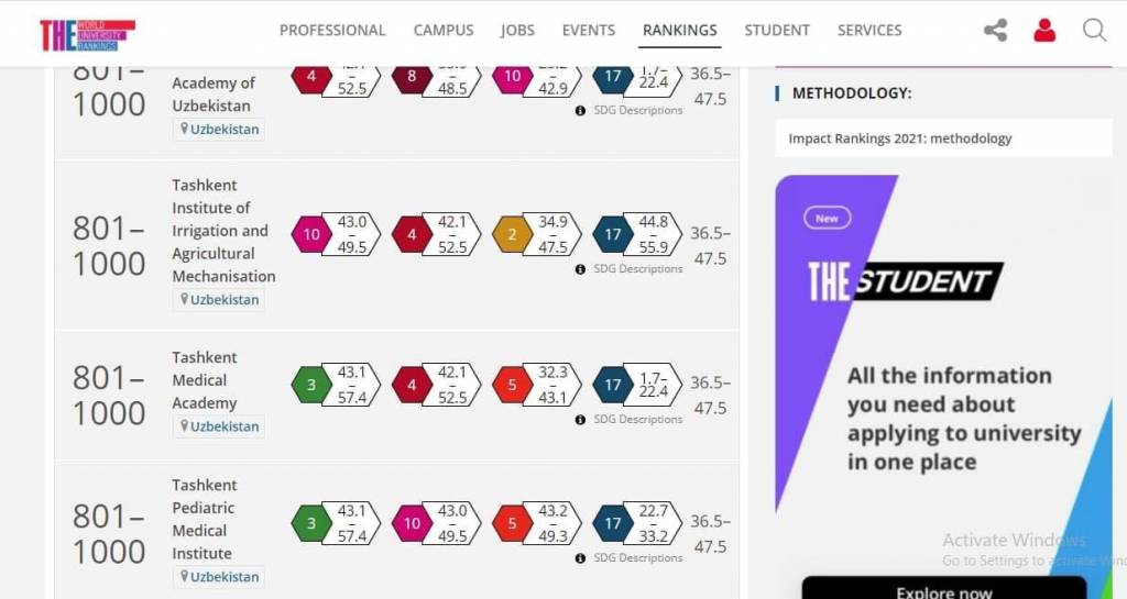 2021 йил 21 апрель куни Буюк Британиянинг олий таълим соҳасига оид муҳим масалаларни ёритувчи ва университетлар фаолиятини баҳолаб борувчи Times Higher Education ташкилоти ўзининг навбатдаги THE Impact Ranking рейтинги натижаларини эълон қилди.
