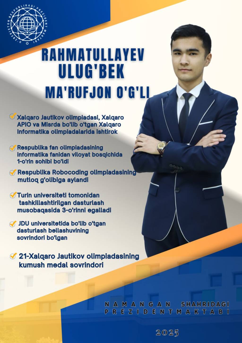 Улуғбек Раҳматуллаев жорий йил 27 июль - 3 август кунлари Боливия Республикасида бўлиб ўтадиган IOI 2025 мусобақасида юртимиз шарафини ҳимоя қилади.