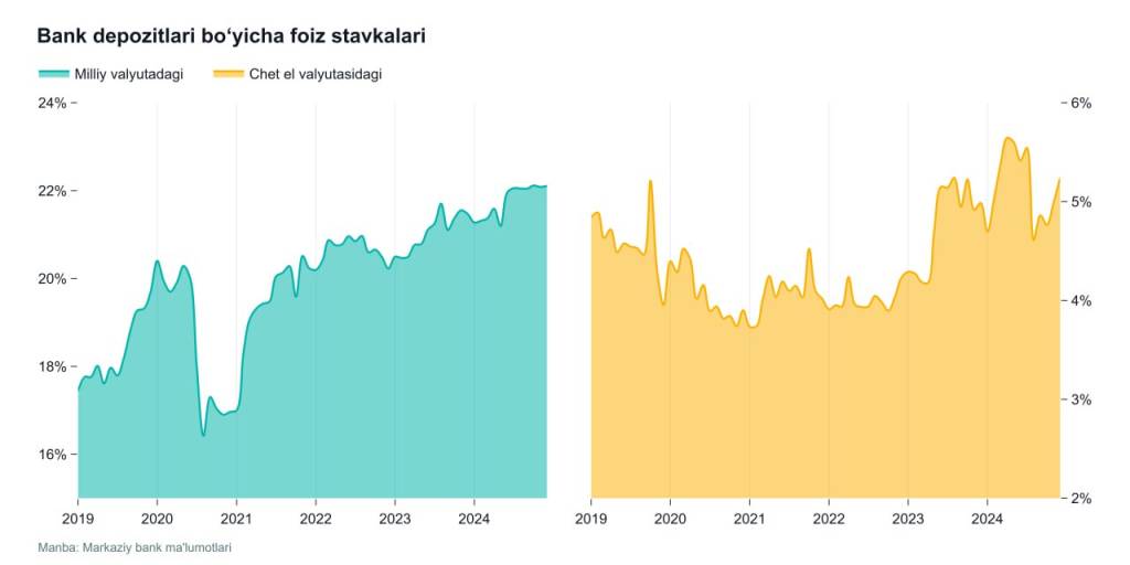 2024 йилнинг иккинчи ярмидан бошлаб уй-жойга инвестиция киритишдан олинадиган даромад жисмоний шахслар учун миллий валютадаги банк депозитларидан олинадиган фоиздан камайган. Миллий валютадаги депозитлар бўйича ўртача фоиз 21-22 фоиз атрофида, чет эл валютасида эса 5 фоизни ташкил этган.