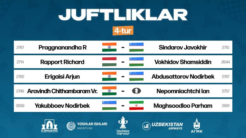 Бугун, 22 июнь куни "Masters" гуруҳида Жавоҳир Синдоров қора доналарда Рамешбабу Праггнанандҳаага, Нодирбек Абдусатторов қора доналарда Аржун Эрийгаисига, Нодирбек Ёқуббоев оқ доналарда эронлик Парҳам Мақсудлуга қарши ҳаракатланади.