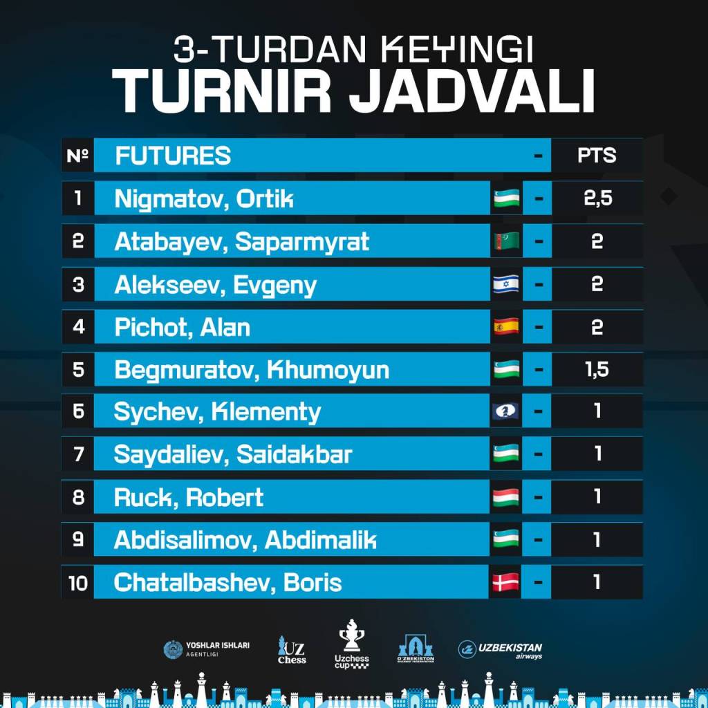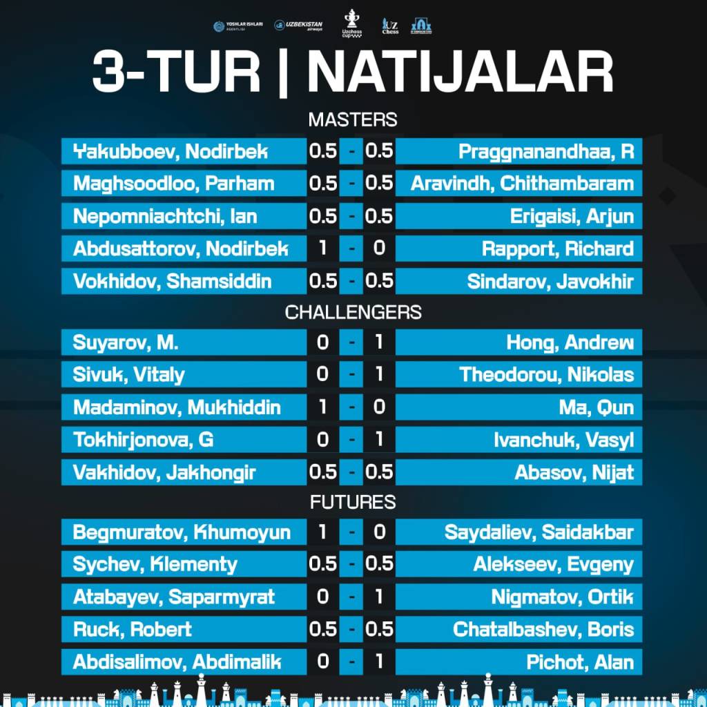 Турнирнинг “Challengers” гуруҳида Гулруҳбегим Тоҳиржонова 3-турда оқ доналарда украиналик тажрибали Василий Иванчукка, Муҳаммадзоҳид Суяров оқ доналар АҚШ вакили Эндрю Ҳонгга имкониятни бой бериб қўйган бўлса, Муҳиддин Мадаминов хитойлик Ма Кунни мағлубиятга учратди. Жаҳонгир Воҳидов озарбайжонлик Нижат Абасов билан муроса йўлини танлади.
