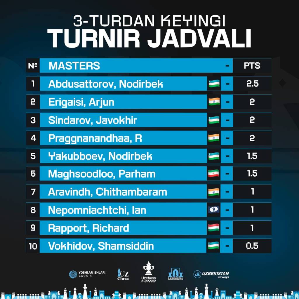 Кеча ўтказилган 3-тур баҳсида Нодирбек Абдусатторов оқ доналарда венгриялик Ричард Раппорт билан кураш олиб борди. Нодирбекнинг аниқ дона суришлари, Ричарднинг 36-юришдаги ишончсиз ҳаракати оқибатида 54-юриш ҳолатида мағлубиятга учратилди. Бу, ўз навбатида, Абдусатторовни турнир давомида 2 та ғалаба, 1 та дуранг билан пешқадамга айлантирди.