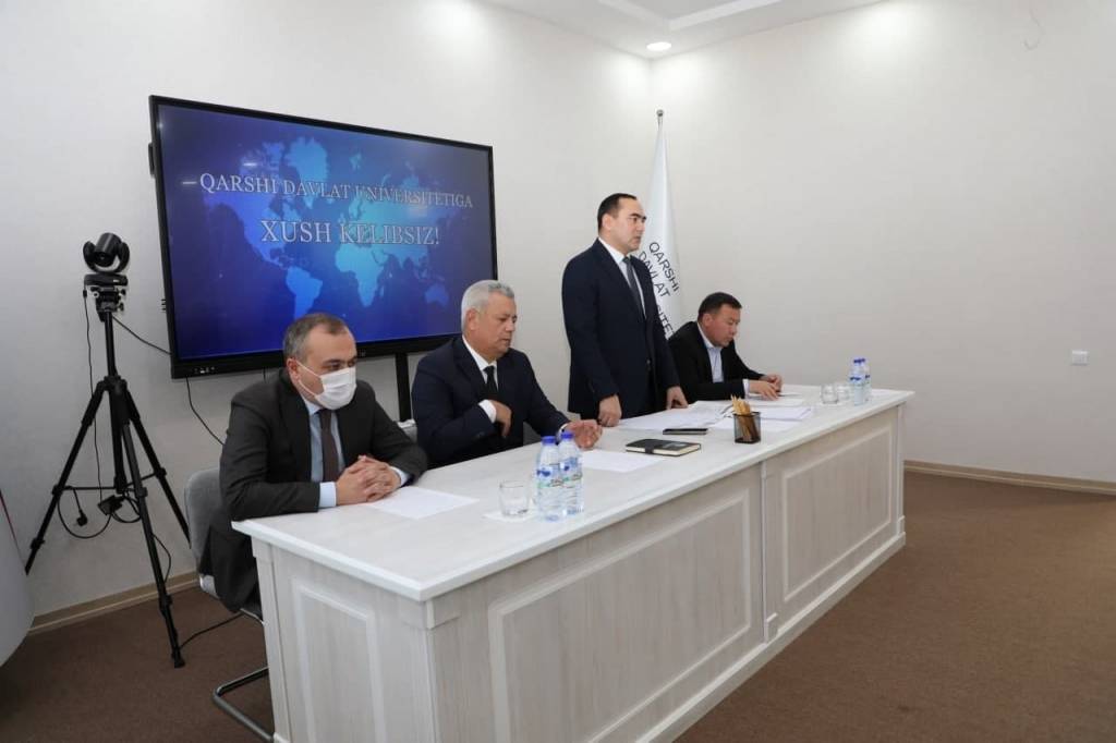 Йиғилишда масъул раҳбарлар вилоятдаги олий таълим муассасаларини комплекс ўрганиш доирасида амалга оширилиши лозим бўлган ишлар хусусида сўз юритди. Ўрганиш жараёнидаги ютуқ ва тажрибалар кенг оммалаштирилиши, мавжуд камчиликларни бартараф этиш бўйича таклифлар билдирилиши таъкидланди. Шундан сўнг ишчи гуруҳ аъзолари Қарши давлат университетининг янгитдан мукаммал таъмирланган, 1 минг 200 ўринга мўлжалланган замонавий ўқув биноси билан танишди. Айтиш жоизки, ўқув биносида интерактив технологиялар асосида замонавий техникалар билан таъминланган рақамли университет маркази ҳамда сўнгги русумдаги компьютерлар билан жиҳозланган компьютер залларини ўзида мужассам этган рақамли таълим технологиялари маркази, кенг ва ёруғ, шинам ўқув аудиториялари, маъруза заллари, шунингдек, атом ва ядро физикаси, қайта тикланадиган энергия манбалари, механика ва молекуляр физика, оптика, электромагнетизм ва радиоэлектроника ҳамда жаҳон банки гранти лойиҳаси доирасида ташкил этилган микро ва наноэлектроника илмий тадқиқот лабораториялари, ҳар бир қаватда QR-кодли электрон китоблардан иборат махсус жавонлар жойлаштирилган.