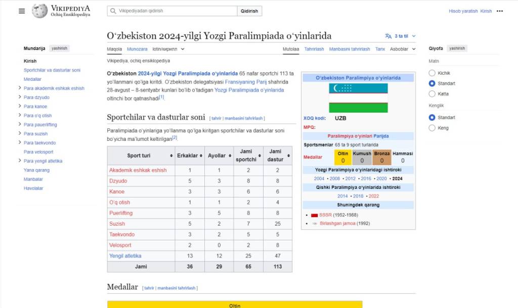 Паралимпия ўйинларини дунё бўйлаб миллионлаб одамлар кузатишмоқда. Ўзбекча Википедия администратори Николай Артемев ҳам бир неча ой давомида маълумот тўплаб, Ўзбекистоннинг Паралимпия ўйинларидаги иштироки ҳақида мақола тайёрлади. Ушбу мақола билан қуйидаги ҳавола орқали танишишингиз мумкин: https://uz.wikipedia.org/wiki/O%CA%BBzbekiston_2024-yilgi_Yozgi_Paralimpiada_o%CA%BByinlarida